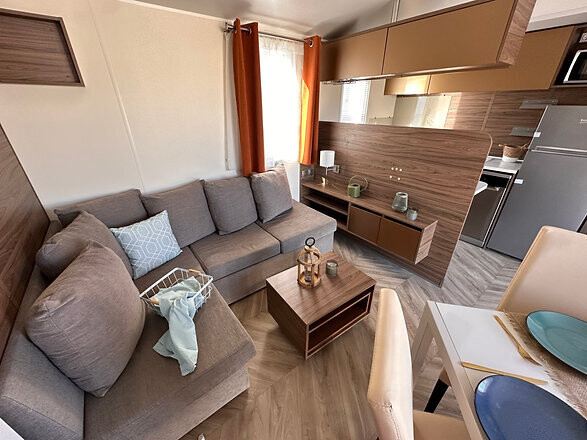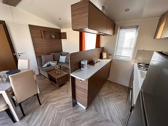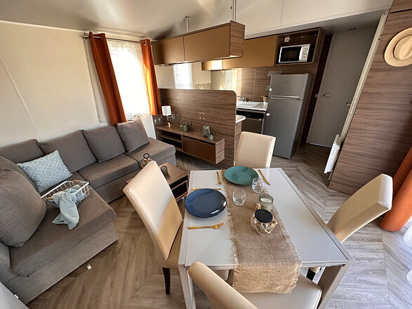 Ao entrar na Casa Móvel T3 IRM HAMPTON RESIDENTIAL, você será imediatamente recebido por um ambiente acolhedor e bem planejado. A sala de estar oferece amplo espaço, com um sofá-canto conversível, perfeito para relaxar após um longo dia. A área de jantar está integrada à cozinha, criando um ambiente familiar e funcional. A cozinha é equipada com eletrodomésticos modernos, incluindo lava-louças, micro-ondas e geladeira com freezer, tudo o que você precisa para preparar suas refeições de forma prática e eficiente.