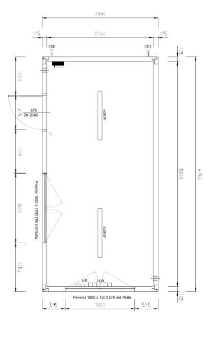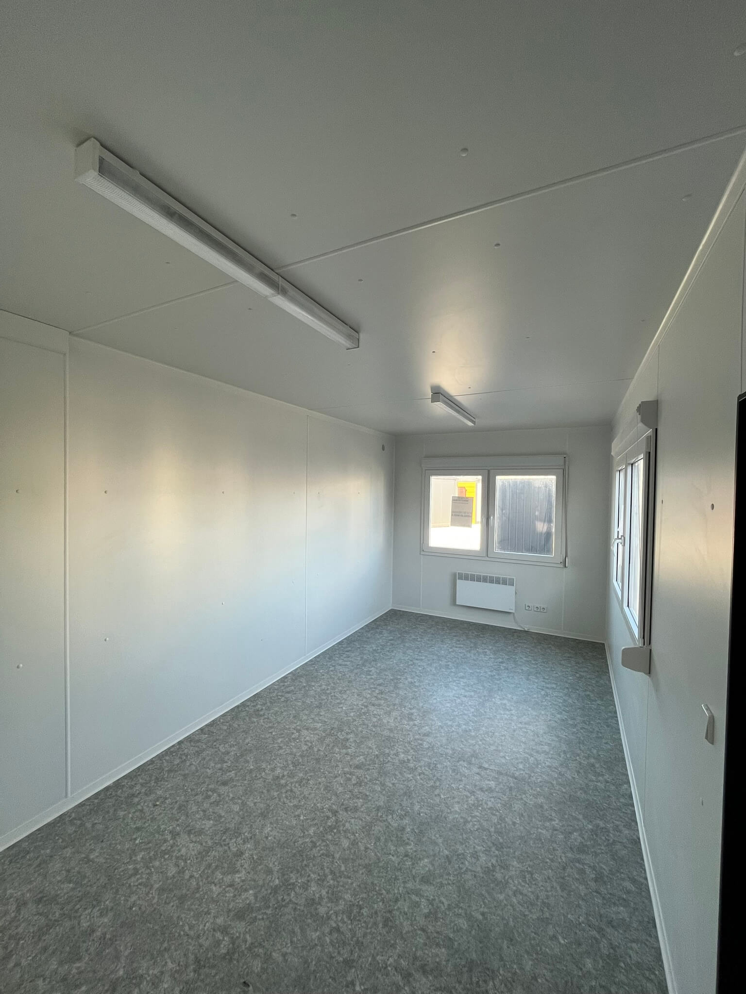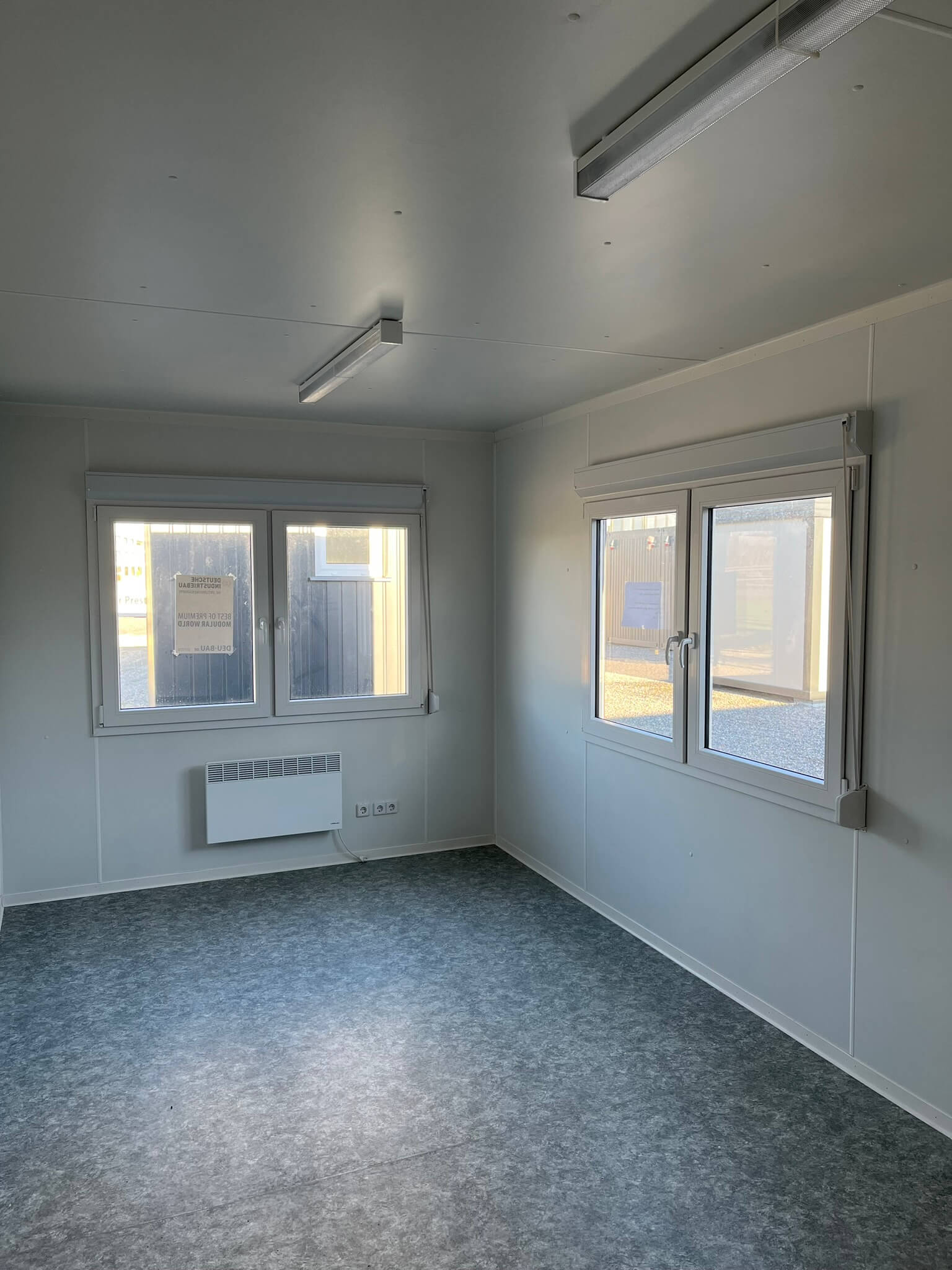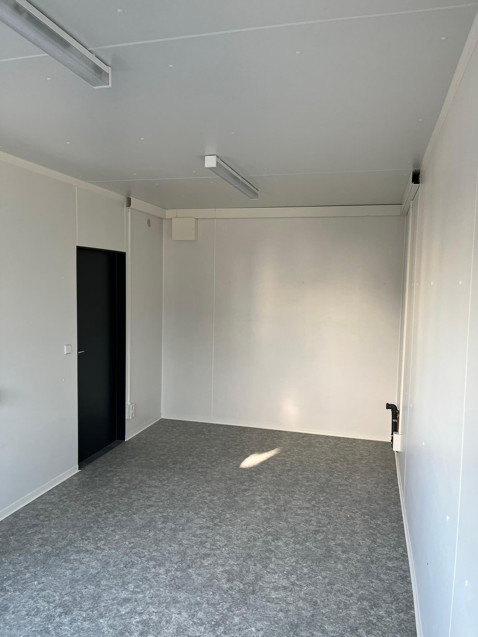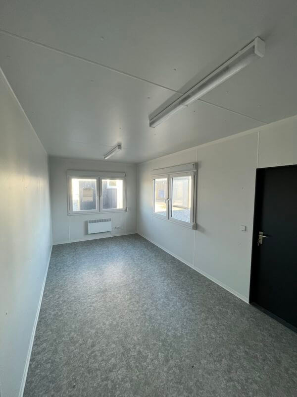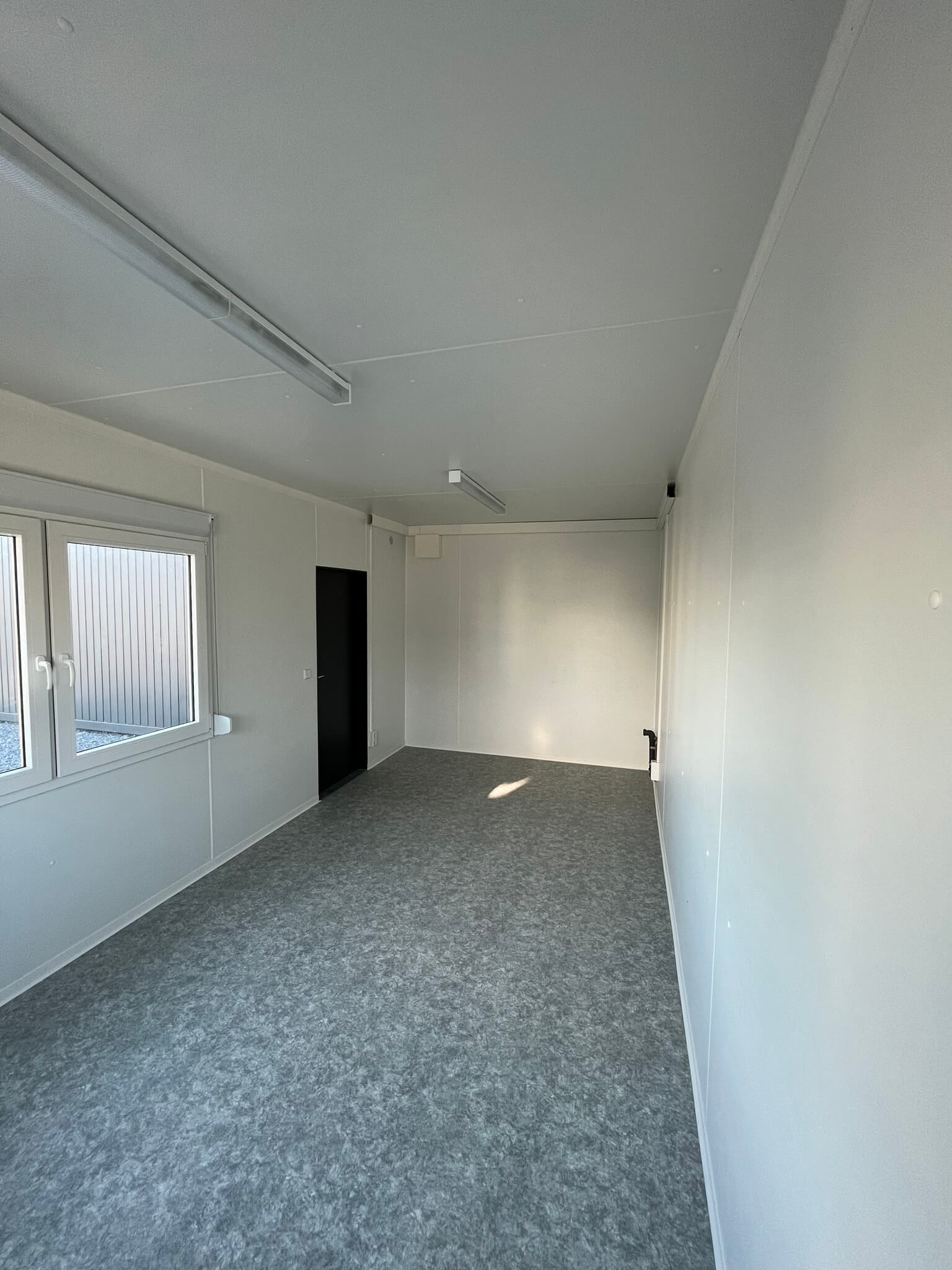 O interior do container possui um piso de PVC, que oferece uma superfície de fácil manutenção e durabilidade. A instalação elétrica é completa, incluindo uma conexão externa via tomadas CEE (400V/32 A) na fachada e toda a fiação necessária. Para uma iluminação adequada, o espaço conta com lâmpadas longas de 2 x 36 watts.